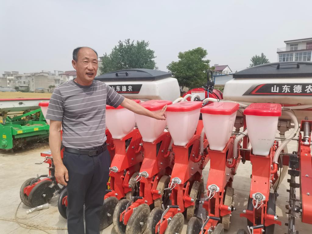 趙化向記者展示新購置的大豆玉米復(fù)式播種機(jī)。新華社記者 水金辰 攝