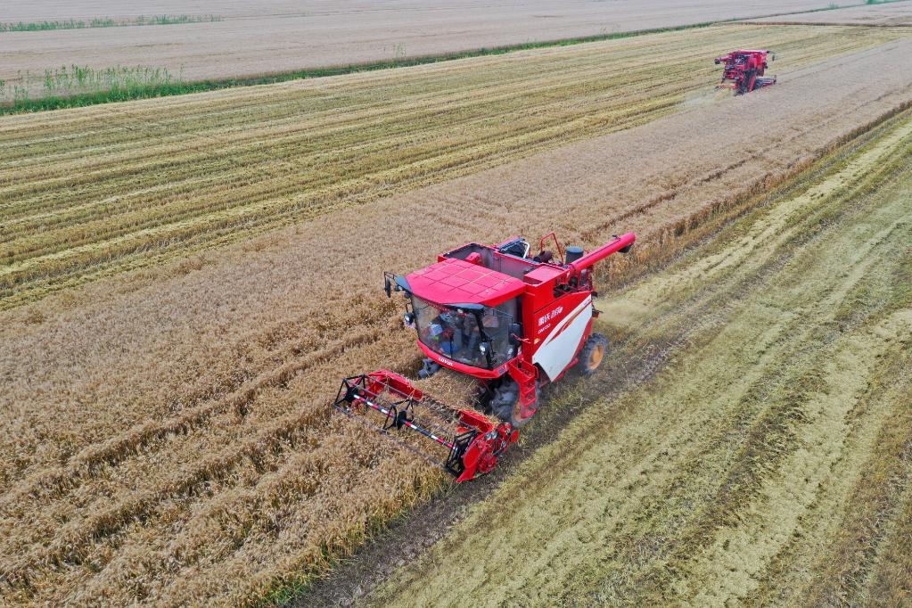 位于安徽省宿松縣的華陽河農(nóng)場(chǎng)機(jī)收小麥現(xiàn)場(chǎng)。新華社發(fā) 李龍 攝