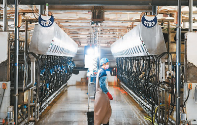 近年來(lái),內(nèi)蒙古自治區(qū)巴彥淖爾市臨河區(qū)干召?gòu)R鎮(zhèn)依托當(dāng)?shù)貎?yōu)勢(shì)大力發(fā)展養(yǎng)牛產(chǎn)業(yè),采取“支部+合作社+基地+農(nóng)戶”的發(fā)展模式,帶動(dòng)農(nóng)戶發(fā)展養(yǎng)牛產(chǎn)業(yè),促進(jìn)農(nóng)戶增收致富,助力鄉(xiāng)村振興。圖為1月19日,巴彥淖爾市臨河區(qū)東鑫奶牛養(yǎng)殖專業(yè)合作社擠奶車間。貝 赫攝(新華社發(fā))