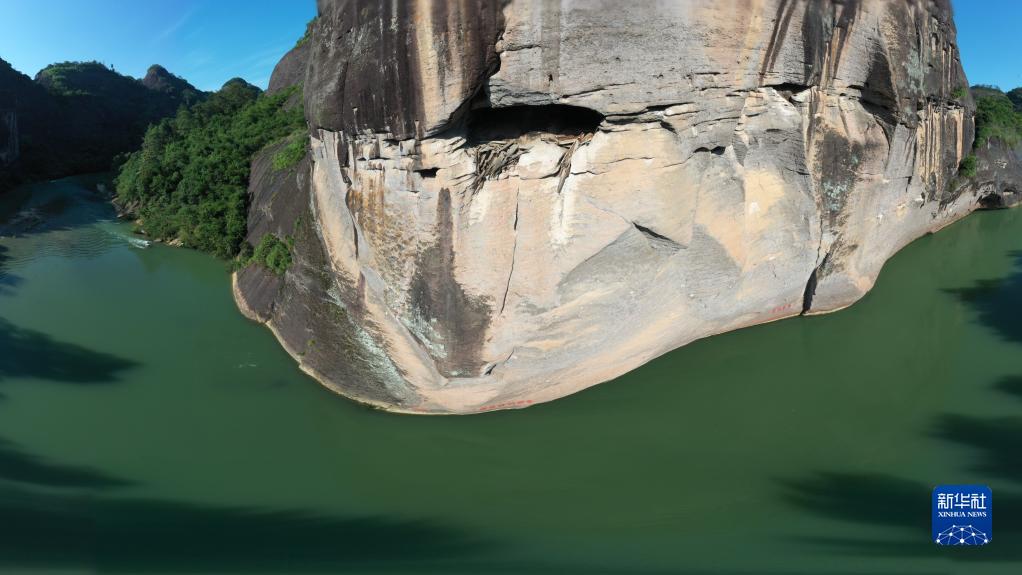 武夷山九曲溪畔丹霞石壁上的架壑船棺(6月6日攝,無人機(jī)照片)。架壑船棺和虹橋板是當(dāng)?shù)毓砰}族的葬俗遺跡。新華社記者 姜克紅 攝