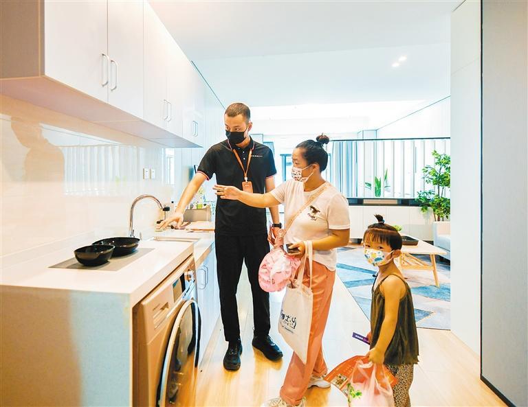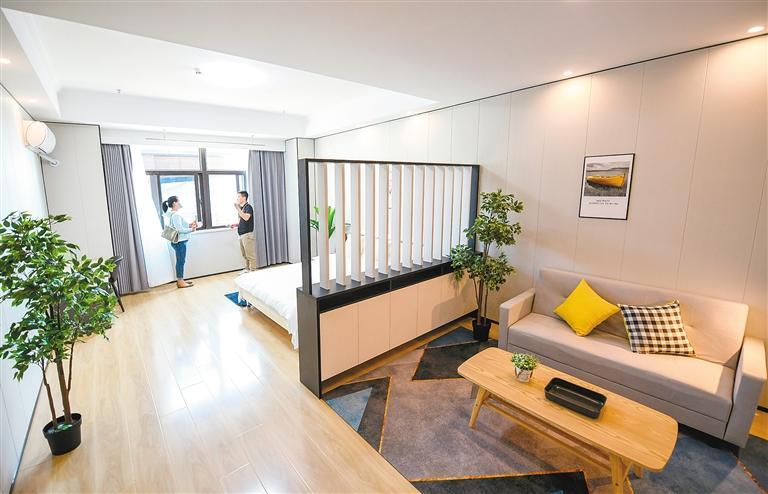 簡單介紹后,工作人員帶著劉女士參觀了位于6樓的樣板間。“真寬敞夠亮堂!”房門打開的一瞬間,劉女士忍不住感嘆道。這套房源有70多平方米,裝修簡約時尚、充滿年輕氣息,洗衣機、冰箱、空調(diào)等設(shè)施一應(yīng)俱全,家具陳列干凈整潔。“真沒想到條件這么好,房間內(nèi)的裝修和家具都是我喜歡的樣子。尤其是房間里有獨立的衛(wèi)浴,住起來會很方便。”劉女士說,自己對房源很滿意。參觀結(jié)束后,劉女士立即向工作人員詳細(xì)詢問租住流程。