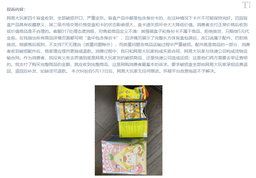 今年5月,在人民網(wǎng)“人民投訴”平臺上,一位網(wǎng)友“吐槽”了自己購買盲盒時遇到的“糟心事”,其表示自己在某平臺購買了盲盒玩具,收到時卻發(fā)現(xiàn)商品破損,但商家不同意更換,并故意拖延不予解決。
