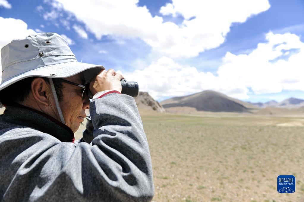 在羌塘國家級自然保護(hù)區(qū),野保員用望遠(yuǎn)鏡觀察野生動物(2018年8月4日攝)。新華社記者 張汝鋒 攝