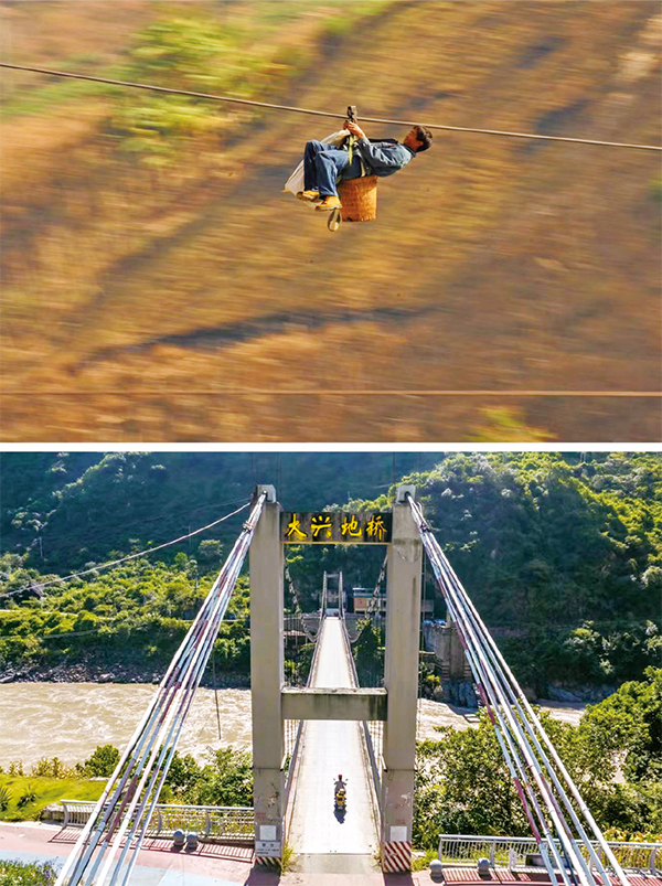 “過江靠溜索”曾是怒江兩岸群眾出行的重要方式。2013年,國家實施“溜索改橋”項目,幫助西部邊遠山區(qū)群眾結束溜索時代,怒江州怒江段上溜索被改造為各式跨江橋梁,完成了沿江人民“天塹變通途”的企盼。上圖為2013年2月2日,在云南省怒江州瀘水市六庫街道,一名居民背著背簍溜索過江(新華社記者 王長山/攝)。下圖為2022年9月13日,瀘水市居民騎摩托車通過大興地橋(無人機照片,新華社記者 江文耀/攝)。