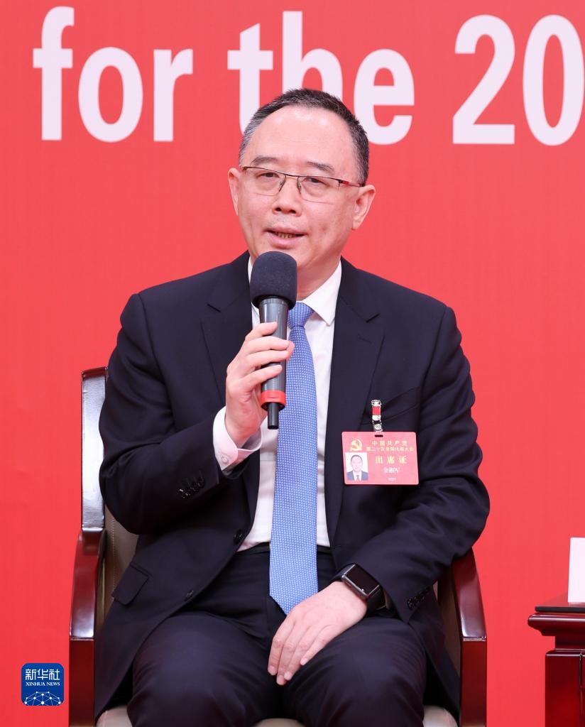 10月18日,中國共產黨第二十次全國代表大會新聞中心舉行集體采訪,請北京、天津、河北、山西、內蒙古、遼寧、吉林代表團新聞發(fā)言人出席,介紹代表團學習討論二十大報告情況,并回答記者提問。這是天津市委副書記金湘軍在回答記者提問。新華社記者 張玉薇 攝