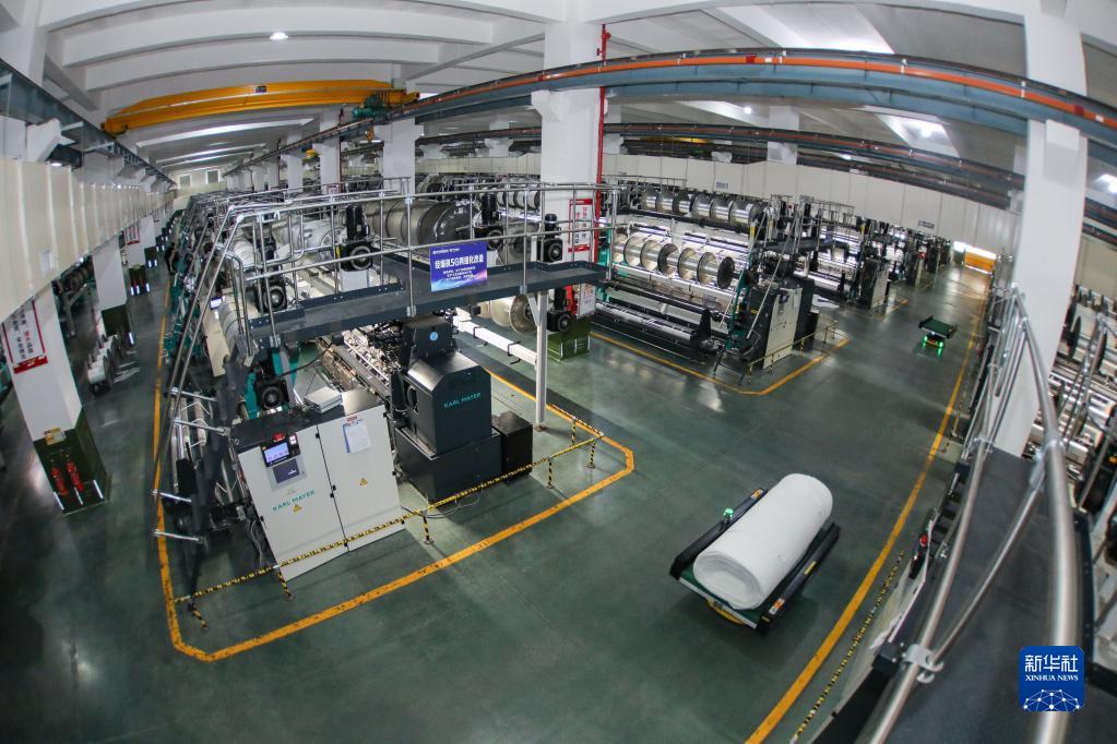 福建晉江,華宇錚鎣集團(tuán)第五經(jīng)編車(chē)間內(nèi),一排排經(jīng)編機(jī)正在高速運(yùn)轉(zhuǎn),AGV物流機(jī)器人不停穿梭其中。