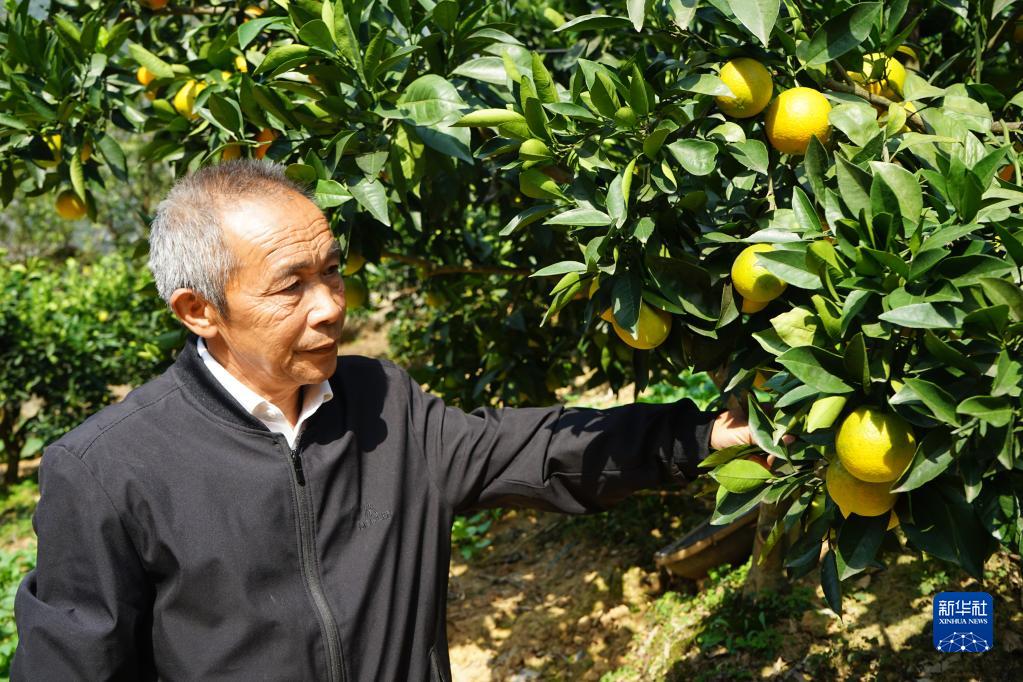 10月16日,全國(guó)脫貧攻堅(jiān)楷模、重慶市巫山縣下莊村黨支部書(shū)記毛相林在自家柑橘園中查看柑橘長(zhǎng)勢(shì)。新華社記者 李曉婷 攝