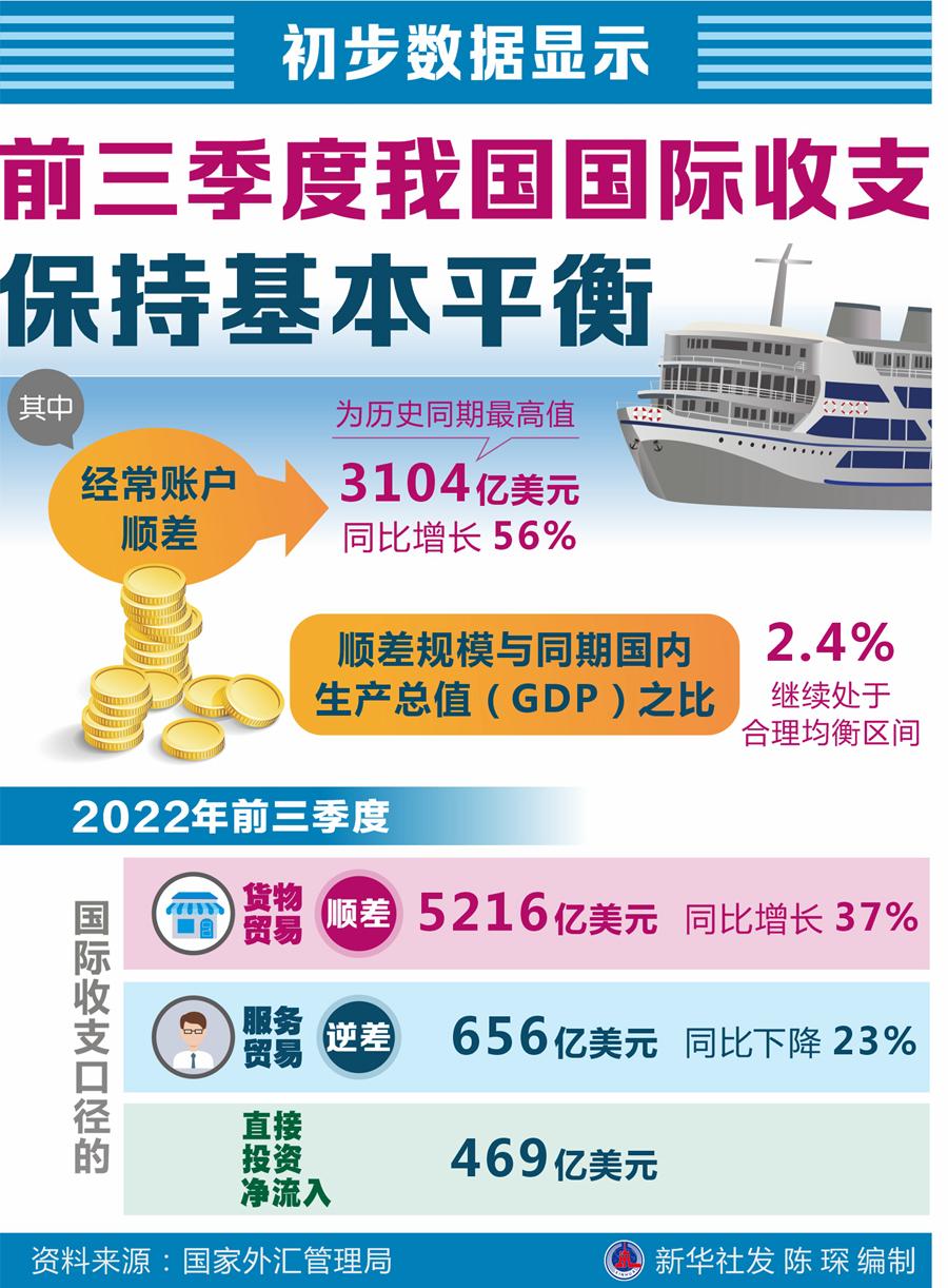 國家外匯管理局4日發(fā)布國際收支平衡表初步數據顯示,2022年前三季度,我國國際收支保持基本平衡。