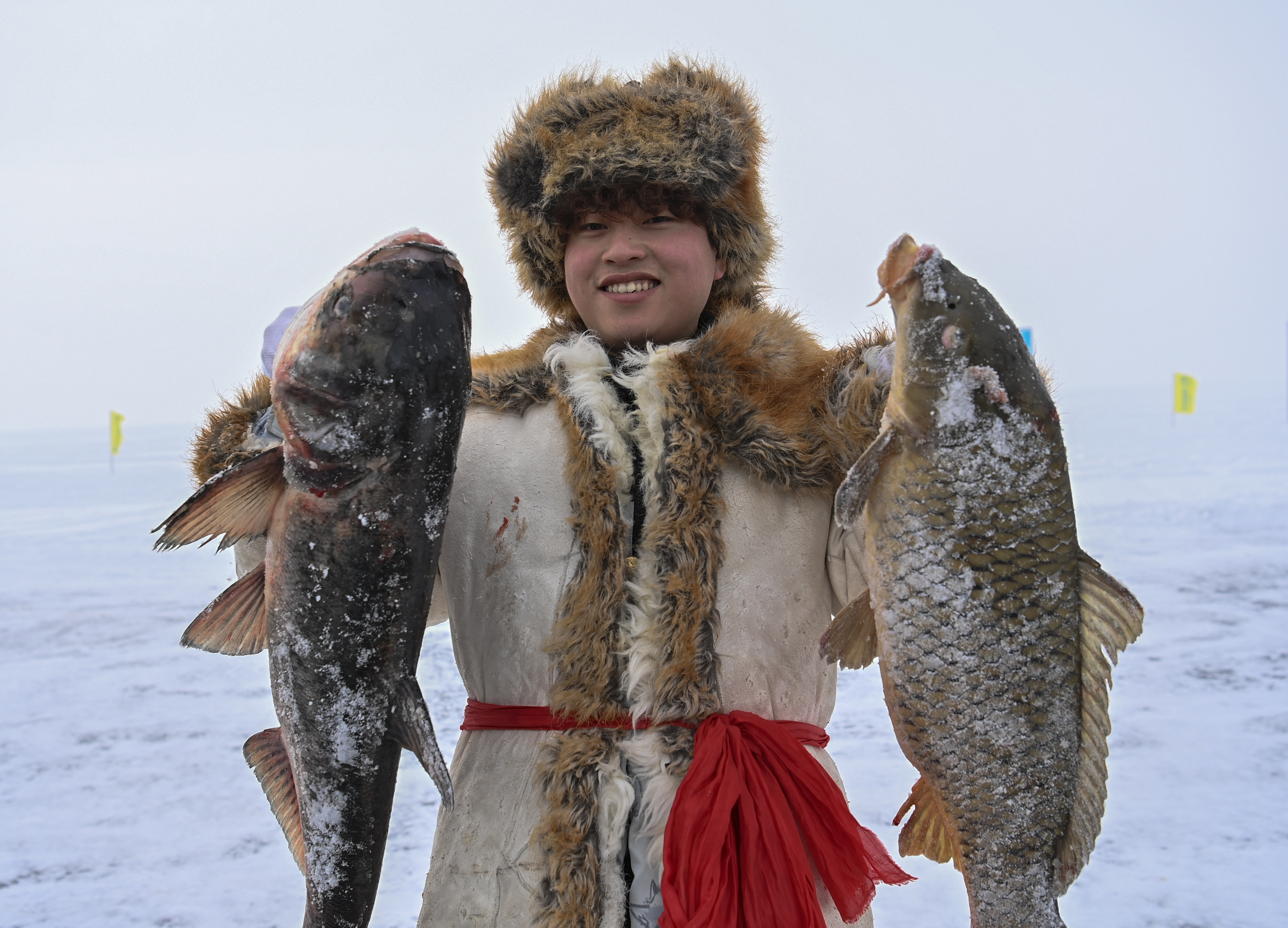2023年1月7日,在新疆福海縣第十六屆烏倫古湖冬捕文化旅游節(jié)上,漁工展示捕到的魚。新華社記者 李響 攝