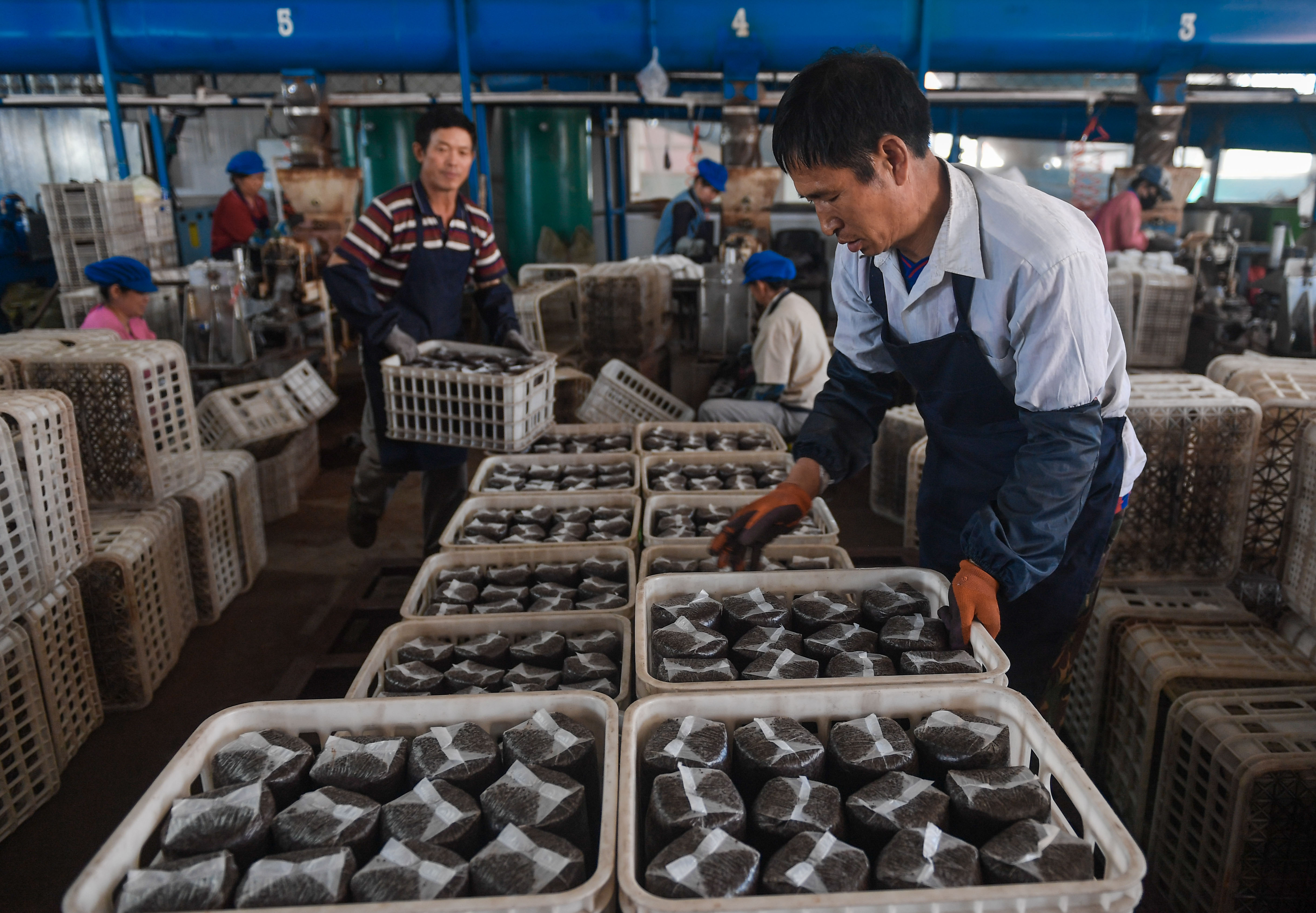 2018年5月24日,吉林省延邊朝鮮族自治州汪清縣天橋嶺鎮(zhèn)農(nóng)民在當(dāng)?shù)匾患揖鼜S內(nèi)搬運(yùn)制作好的黑木耳菌袋。新華社記者 許暢 攝