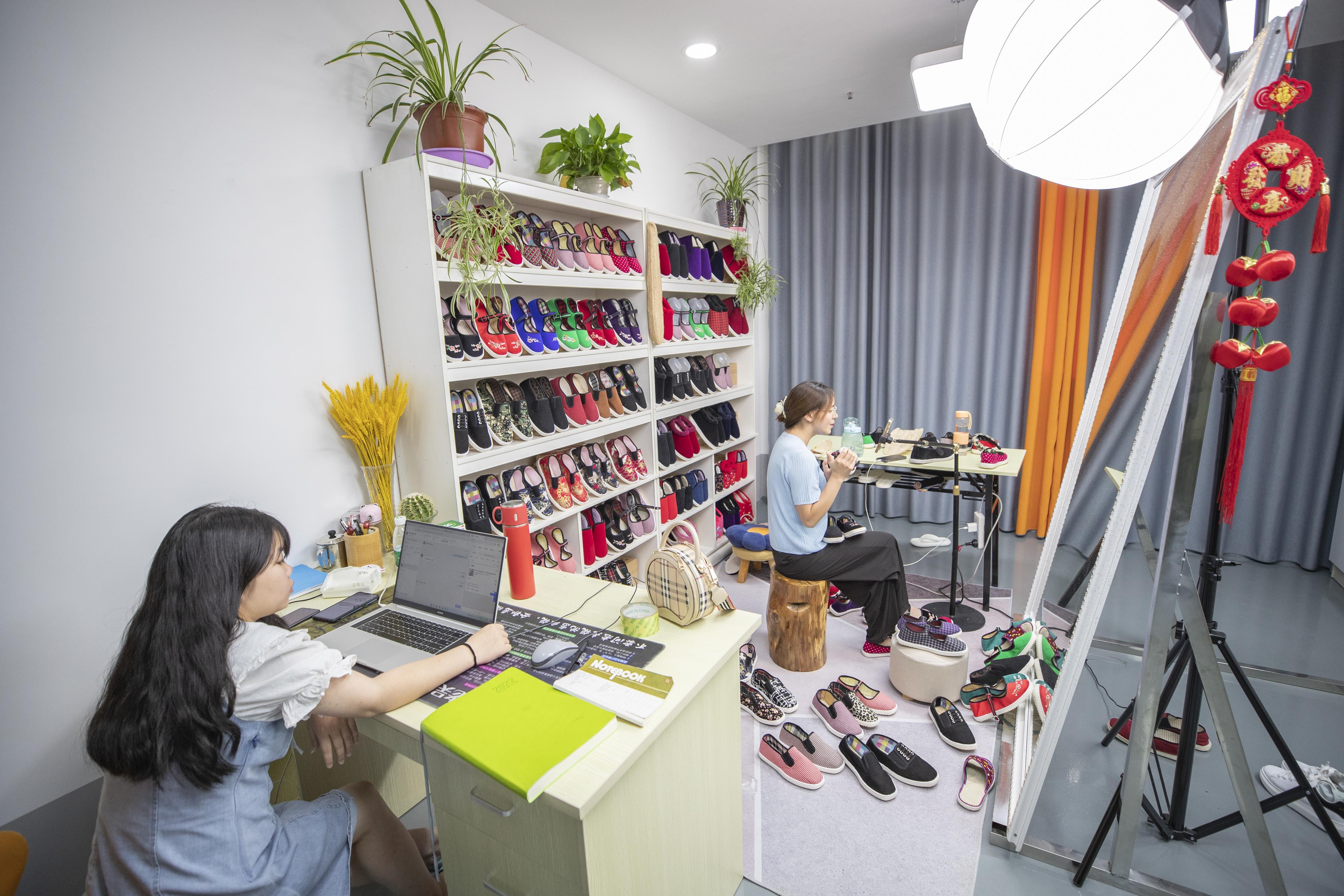 2022年8月20日,在重慶市巫溪縣文峰鎮(zhèn)農(nóng)民工返鄉(xiāng)創(chuàng)業(yè)園,重慶何航鞋業(yè)有限公司的主播們在向直播間粉絲們推介各色布鞋。新華社記者 黃偉 攝