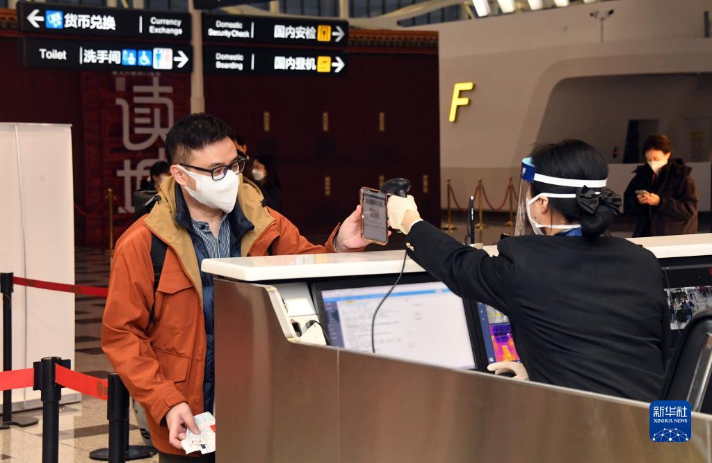 1月17日,在北京大興機場,海關(guān)關(guān)員核驗乘坐CZ309次北京飛往香港航班旅客的海關(guān)健康申報二維碼。新華社記者 任超 攝