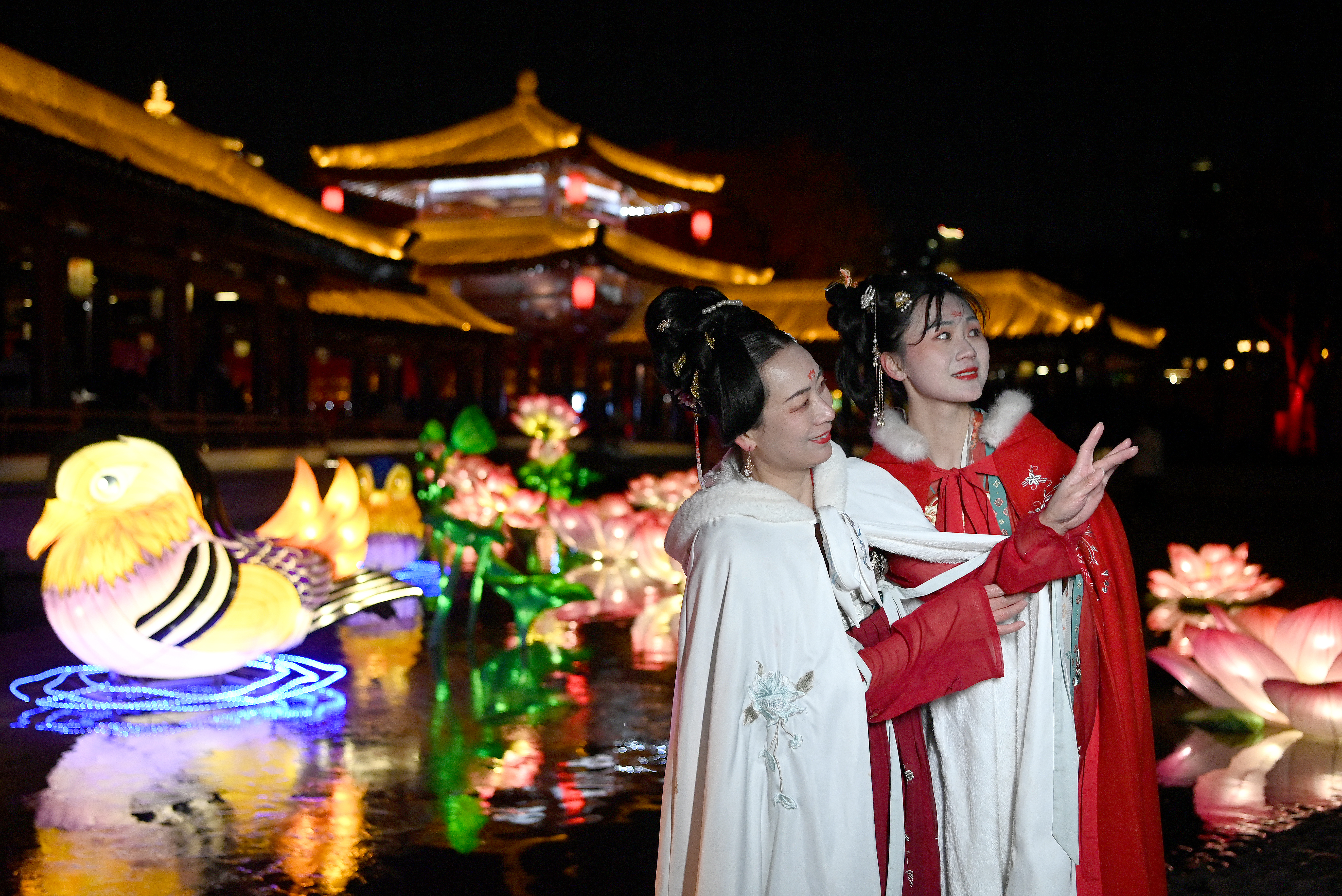 游人在西安大唐芙蓉園內(nèi)賞燈合影(1月24日攝)。新華社記者 劉瀟攝