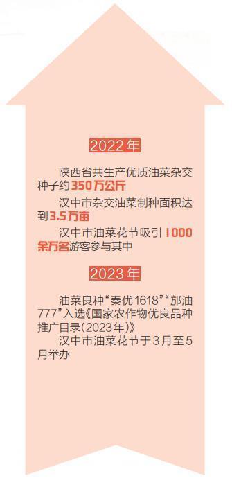陜西是雜交油菜種業(yè)強省,雜交油菜育種研究和產(chǎn)業(yè)化開發(fā)一直走在全國前列。2022年,陜西省制定《油菜產(chǎn)業(yè)綠色革命科技三年行動實施方案》,取得明顯成效。陜西省去年全年共生產(chǎn)優(yōu)質(zhì)油菜雜交種子約350萬公斤。勉縣、城固縣、洋縣入選全國油菜產(chǎn)業(yè)綠色革命科技示范縣;陜西農(nóng)業(yè)科研單位培育的油菜良種“秦優(yōu)1618”“邡油777”入選2022年國家糧油生產(chǎn)主導(dǎo)品種和《國家農(nóng)作物優(yōu)良品種推廣目錄(2023年)》;漢中市農(nóng)業(yè)農(nóng)村局啟動糧油“百千萬”豐產(chǎn)示范工程,在全市11個縣(區(qū))建立油菜優(yōu)良品種和綠色高產(chǎn)高效生產(chǎn)技術(shù)百畝示范點56個8100畝、千畝示范片23個2.9萬畝、萬畝示范帶9個10.5萬畝;漢中市南鄭區(qū)和勉縣被農(nóng)業(yè)農(nóng)村部認(rèn)定為國家級油菜制種大縣。漢中市委、市政府提出“最強產(chǎn)業(yè)、最優(yōu)種業(yè)、最美花海”的發(fā)展戰(zhàn)略,以“花”為媒,將漢中市油菜花節(jié)打造成推動鄉(xiāng)村振興和發(fā)展文化旅游的重要載體。2022年,1000余萬名游客前來觀光旅游或參與線上活動。“油菜經(jīng)濟”堪稱陜西的一張金色名片。