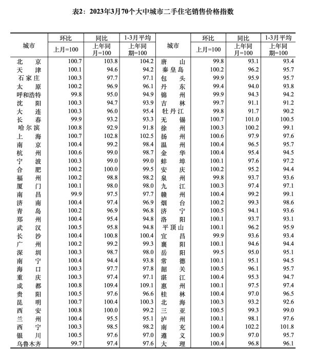 2023年3月70個(gè)大中城市二手住宅銷售價(jià)格指數(shù)。 截圖自國(guó)家統(tǒng)計(jì)局官網(wǎng)