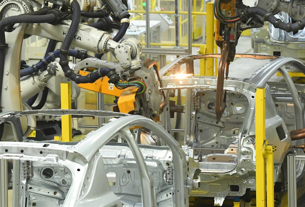 4月11日,智能機(jī)器人在領(lǐng)克汽車(chē)寧波余姚工廠焊裝車(chē)間工作。新華社記者翁忻旸 攝