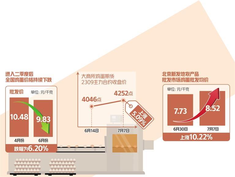 7月7日,大商所雞蛋期貨2309主力合約以4252點報收,比6月14日收盤4046點上漲5.09%。一些地方雞蛋現(xiàn)貨價格也顯著反彈。7日,北京新發(fā)地農(nóng)產(chǎn)品批發(fā)市場雞蛋批發(fā)均價為8.52元/千克,比上周同期(6月30日)的7.73元/千克上漲10.22%。“本周蛋價快速反彈不具有可持續(xù)性,僅是正常波動。當(dāng)前雞蛋供應(yīng)仍然充足,沒有出現(xiàn)供不應(yīng)求的狀況。”北京新發(fā)地農(nóng)產(chǎn)品批發(fā)市場統(tǒng)計部經(jīng)理劉通介紹。