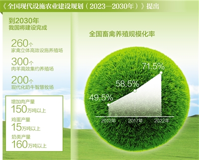 規(guī)模化設(shè)施化養(yǎng)殖助推畜牧業(yè)綜合產(chǎn)能提升。《全國(guó)現(xiàn)代設(shè)施農(nóng)業(yè)建設(shè)規(guī)劃(2023—2030年)》(以下簡(jiǎn)稱《規(guī)劃》)提出,到2030年建設(shè)完成260個(gè)家禽立體高效設(shè)施養(yǎng)殖場(chǎng)、200個(gè)肉牛高效集約養(yǎng)殖場(chǎng)、300個(gè)肉羊高效集約養(yǎng)殖場(chǎng)和200個(gè)現(xiàn)代化奶牛智慧牧場(chǎng),增加肉產(chǎn)量150萬(wàn)噸以上、雞蛋產(chǎn)量15萬(wàn)噸以上、奶類產(chǎn)量160萬(wàn)噸以上,我國(guó)的肉蛋奶供應(yīng)保障水平將進(jìn)一步提高。