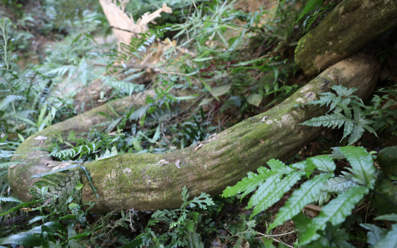 藤是蔓生植物,柔軟,細長。平時見到的藤蔓,最粗也不過手腕般粗。而眼前這根巨藤,乍一看,竟以為是伏臥在山谷間的一棵大樹。只有走上前去,順著它筋骨畢露的軀干,一路尋向它躍入林梢的身影,才能確認它的確是一根藤。然而,也只能看清它橫跨山谷間的一截身段而已,根本見不到它飛騰盤繞在樹冠之上的龐大身軀。一根柔軟的藤長大到你的經(jīng)驗之外,真是太驚悚了。難道成精了?那它要歷經(jīng)多少輪回的修煉?才有如此正果。