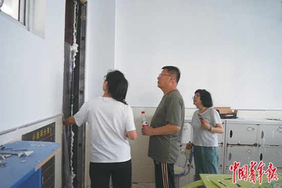 8月21日,北京市房山區(qū)石樓中學(xué),校長(zhǎng)郭洪生(中)與工作人員檢查教室整修情況。此前,兩所學(xué)校由一套班子管理,北京市房山區(qū)石樓中學(xué)校長(zhǎng)郭洪生同時(shí)任夏村中學(xué)校長(zhǎng)。張藝/攝