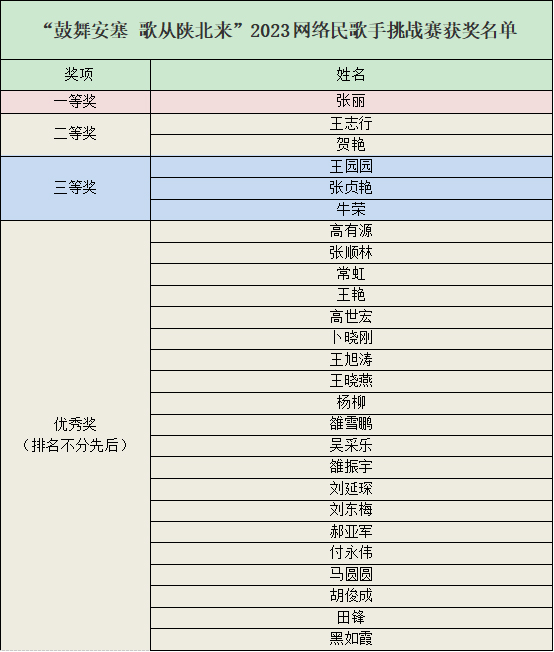 決賽現(xiàn)場(chǎng),參賽選手們依次上場(chǎng)深情獻(xiàn)唱,《一對(duì)對(duì)鴛鴦水上漂》《小桃紅》《走西口》等經(jīng)典的陜北民歌喚起在場(chǎng)群眾陣陣掌聲。最終,經(jīng)過(guò)一番精彩獻(xiàn)唱,專(zhuān)家評(píng)審團(tuán)現(xiàn)場(chǎng)打分決出“鼓舞安塞 歌從陜北來(lái)”2023網(wǎng)絡(luò)民歌手挑戰(zhàn)賽一、二、三等獎(jiǎng)獲獎(jiǎng)選手及優(yōu)秀選手。其中,張麗獲得一等獎(jiǎng),王志行、賀艷獲得二等獎(jiǎng),王園園、張貞艷、牛榮獲得三等獎(jiǎng),因4名民歌歌手棄權(quán)比賽,剩余20名民歌歌手均獲優(yōu)秀獎(jiǎng)。