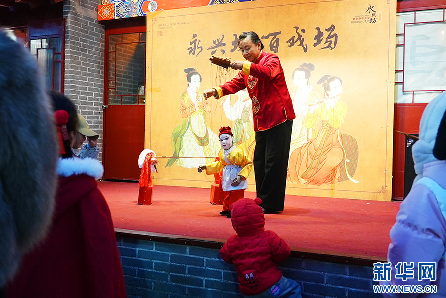 在西安永興坊——陜西非遺文化特色街區(qū),今年56歲的王春桃,為小朋友們表演國家級非遺合陽提線木偶戲《賣雜貨》。 新華網(wǎng) 楊喜龍 攝