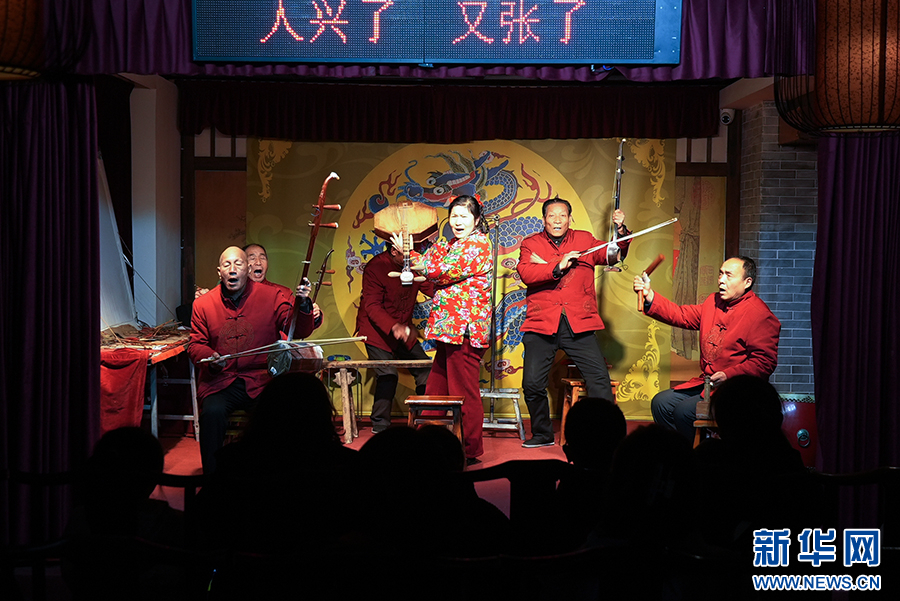 在西安永興坊——陜西非遺文化特色街區(qū),今年52歲的秦腔演員王波,為游客表演國家級非遺陜西地方曲藝“眉戶”經(jīng)典片段《張連賣布》。新華網(wǎng) 楊喜龍 攝