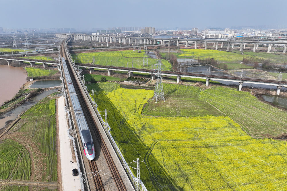 2024年3月2日,一輛高鐵列車從江西省南昌市南昌縣一處油菜花田旁駛過(無人機照片)。新華社記者 金良快 攝