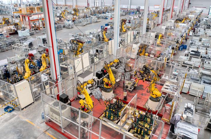 2024年1月8日,在位于浙江省湖州市長興經濟技術開發(fā)區(qū)的長興地通汽車部件有限公司,全自動機器人高速運轉生產新能源汽車配件訂單產品(無人機照片)。新華社發(fā)(譚云俸攝)