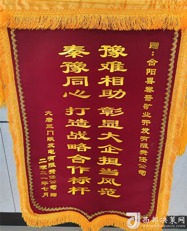 近日,大唐三門(mén)峽發(fā)電有限公司為秦晉集團(tuán)公司送來(lái)了感謝函,并將一面寫(xiě)有“豫難相助,彰顯大企擔(dān)當(dāng)風(fēng)范,秦豫同心,打造戰(zhàn)略合作標(biāo)桿”的錦旗送到了秦晉集團(tuán)公司,對(duì)秦晉集團(tuán)“一方有難八方支援”的大愛(ài)精神表示感謝!(圖/文:聶曉英)